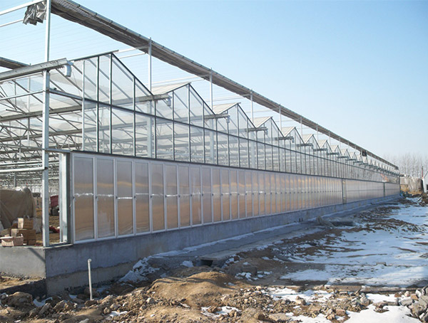 頂部覆蓋采用防紫外線防結露聚碳酸酯中空板,四周墻體按常規要求為聚碳酸脂中空板或采用玻璃,根據地區氣候條件的差異,在一些寒冷地區(如吉林、黑龍江等地),北墻體可采用保溫復合板,還可以安裝推拉窗,增加溫室通風面積。